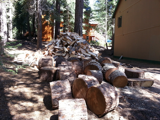 A local tree cutting contractor came with his crew, chain saws, large truck with shredder and they went to work. Juan Estrada of Mountain Tree Services mountainje@hotmail.com and his crew were amazing! I was in the SF Bay Area that morning but Bob described how Juan carefully climbed each tree with ropes and climbing gear. He then proceeded to limb the entire tree, then he went back to the top and started carefully roping off and chain sawing sections which were each lowered down to his crew. It was like an choreographed dance. Each huge section carefully dropped so nothing touched either our house or the neighbors house which were both so close. Each tree section was cut into a 16 inch round which was moved to the back of the house for Bob & I to split on Saturday. They left the trees with about 5 feet still standing so that the excavating crew could pull the entire stumps out as the stumps would be too close to the addition to leave in the ground. They did a wonderful job and cleaned up everything. For the big tree by the deck, it was cut close to the ground and the stump will be ‘ground out’ later. If that stump was pulled out; our driveway would also be pulled out!