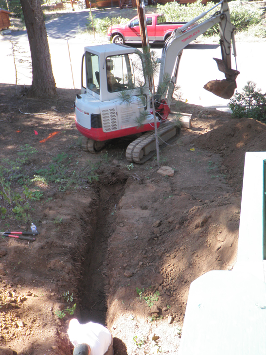 You may say-hey, move utilities underground was not listed on the scope! You would be right. We realized that this is the time if ever to get rid of all the ugly wires from the telephone pole to the house and to remove possible winter issues with too much snow breaking the lines away from the house. So–what’s one more trench! Lucky for us we have our friend Vince to convince us that this is a good thing and to explain the process, so that when we call Truckee Donner Public Utility District we know some of the questions to ask so that we could get to the right person to walk us thru the process.
