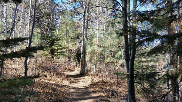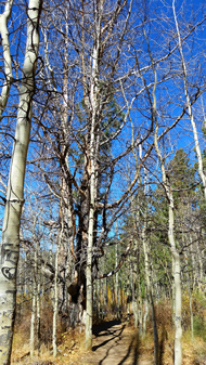 The trail just up from the lake alternated between Aspen groves and large pine trees